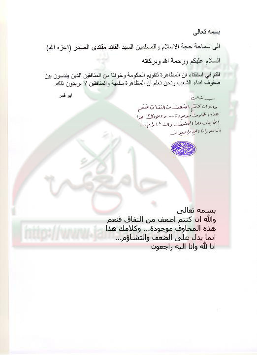 والله ان كنتم اضعف من النفاق فنعم هذه المخاوف موجودة ( استفتاء للسيد القائد مقتدى الصدر اعزه الله بتاريخ 6-9-2011)