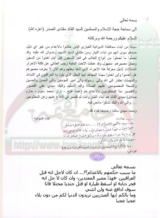 احكام الاعدام ان كان من اجل قتل العراقيين فهذا مصيرهم ,وان كان من اجل تدمير دبابة فانا سوف ادافع عنه ولن انثني ( استفتاء للسيد القائد مقتدى الصدر اعزه الله بتاريخ 9-9-2011)