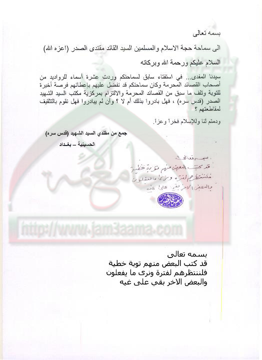 توبة الرواديد من اصحاب القصائد المحرمة ( استفتاء للسيد القائد مقتدى الصدر اعزه الله بتاريخ 9-9-2011)