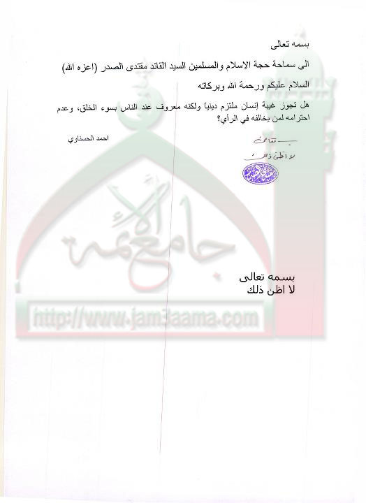 لا تجوز غيبة انسان ملتزم دينيا ولكنه معروف عند الناس بسوء الخلق ( استفتاء للسيد القائد مقتدى الصدر اعزه الله بتاريخ 11-9-2011)