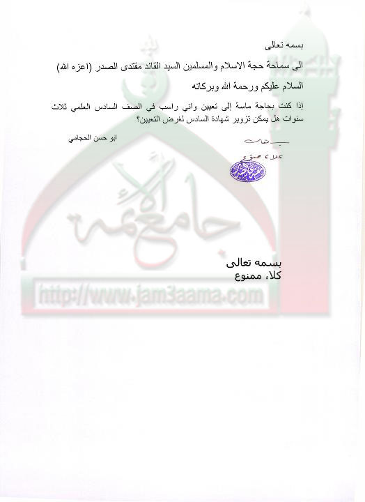 لا يجوز تزوير الشهادة لاجل التعيين ( استفتاء للسيد القائد مقتدى الصدر اعزه الله بتاريخ 11-9-2011)