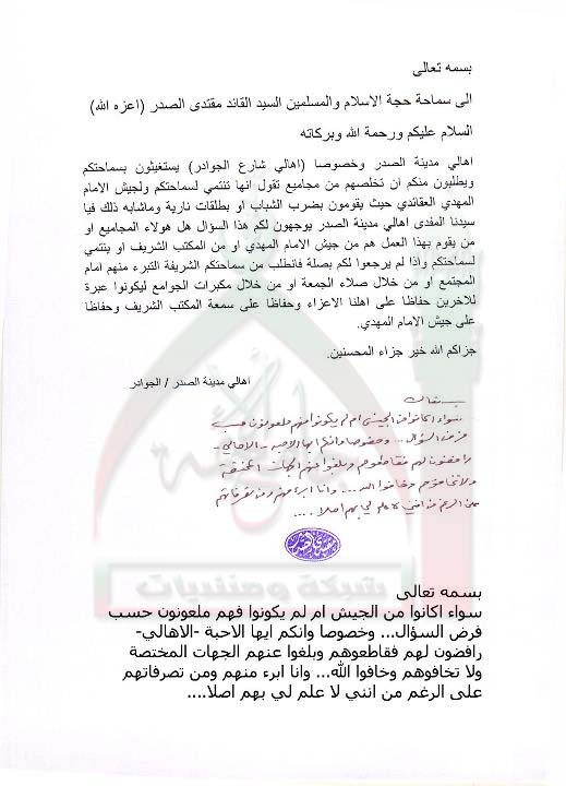 من يسيىء الى الاهالي...سواء كان من الجيش ام لم يكونوا فهم ملعونون ( استفتاء للسيد القائد مقتدى الصدر اعزه الله بتاريخ 11-9-2011)