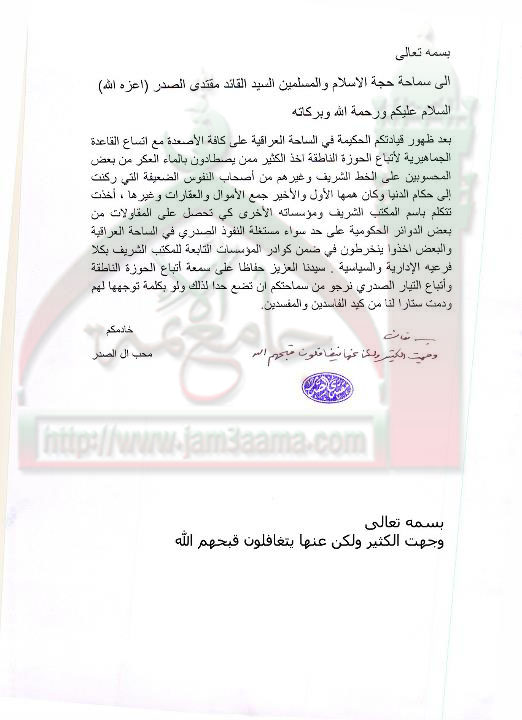 وجهت الكثير للفاسدين والمفسدين ..ولكن عنها يتغافلون قبحهم الله ( استفتاء للسيد القائد مقتدى الصدر اعزه الله بتاريخ 11-9-2011)