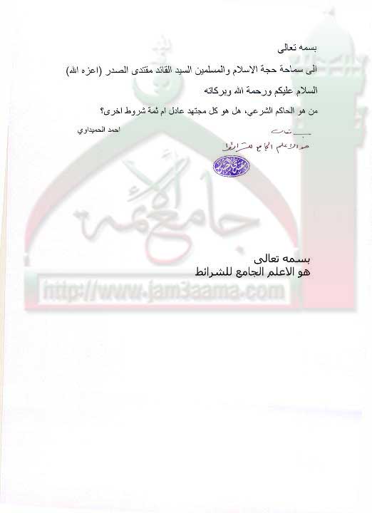 الحاكم الشرعي هو المجتهد الاعلم الجامع للشرائط ( استفتاء للسيد القائد مقتدى الصدر اعزه الله بتاريخ 11-9-2011)