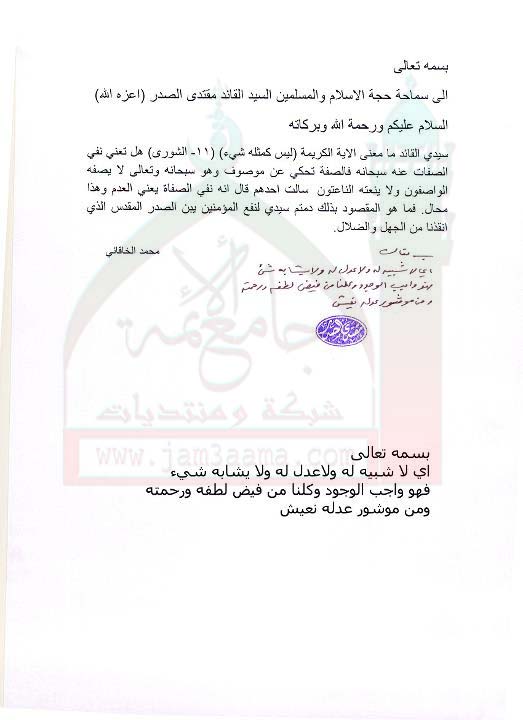 معنى الاية (11) من سورة الشورى(( ليس كمثله شيء)) ( استفتاء للسيد القائد مقتدى الصدر اعزه الله بتاريخ 12-9-2011 )