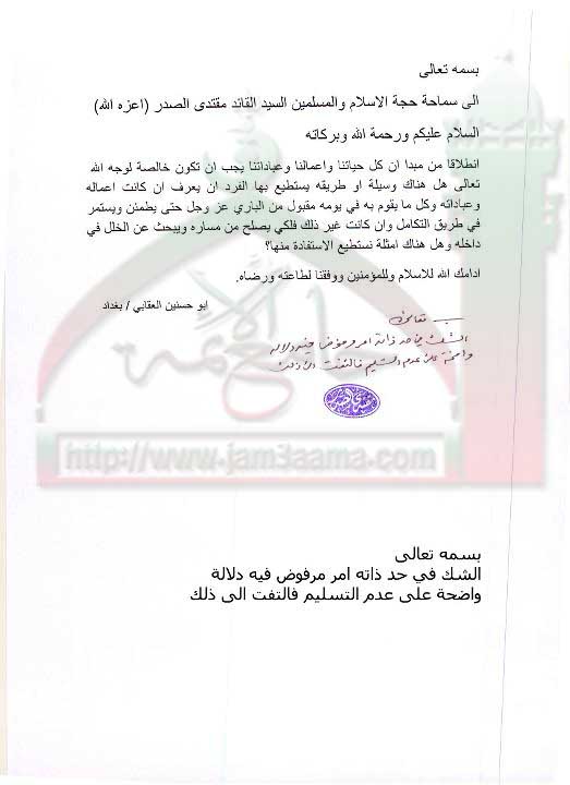 الشك في قبول الاعمال ( استفتاء للسيد القائد مقتدى الصدر اعزه الله بتاريخ 12-9-2011 )