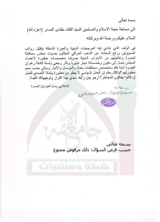 صرف مخصصات خطورة لاعضاء مجلس محافظة البصرة ( استفتاء للسيد القائد مقتدى الصدر اعزه الله بتاريخ 13-9-2011 )