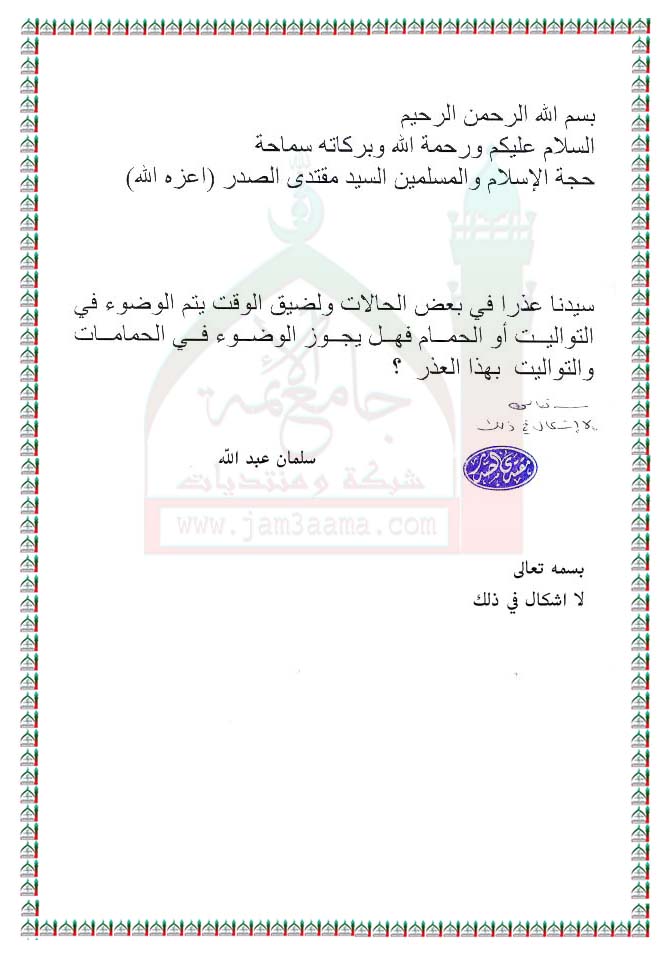 جواز الوضوء في الحمّامات والتواليت(استفتاء للسيد القائد بتاريخ 24-12-2010)