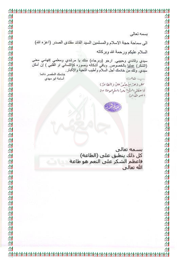 معنى الشكر استفتاء للسيد القائد مقتدى الصدر اعزه الله بتاريخ 19-9-2011