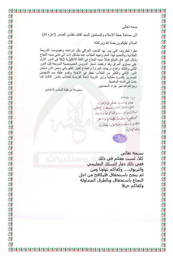 الطلب من سماحته بمطالبة وزير التربية اتاحة دور ثالث استفتاء للسيد القائد مقتدى الصدر اعزه الله بتاريخ 19-9-2011