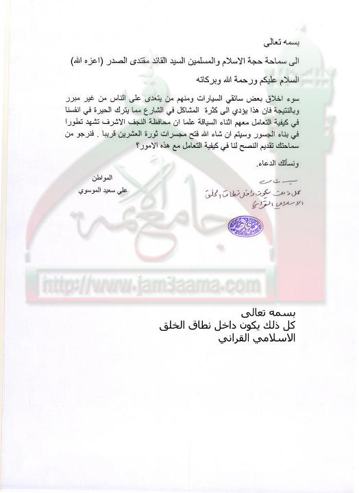 سوء اخلاق بعض سائقي السيارات ( استفتاء للسيد القائد مقتدى الصدر اعزه الله بتاريخ 19-9-2011)