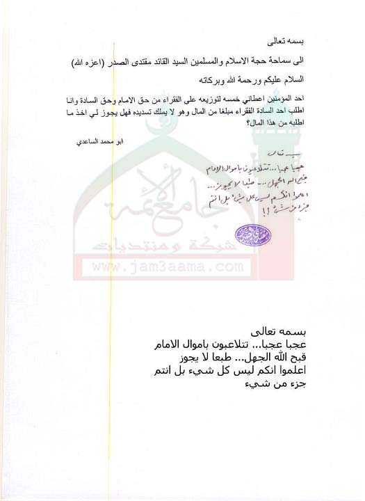 استيفاء الدين من الخمس ( استفتاء للسيد القائد مقتدى الصدر اعزه الله بتاريخ 19-9-2011)