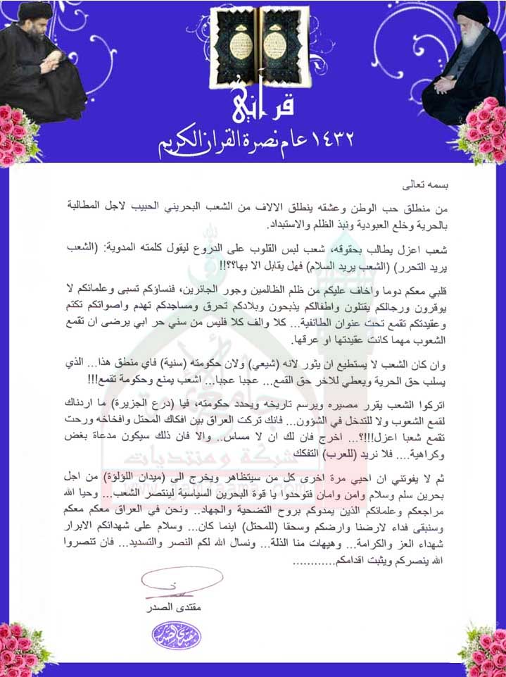 رد: الى شعب البحرين البطل ( بيان للسيد القائد مقتدى الصدر اعزه الله بتاريخ 20-9-2011)