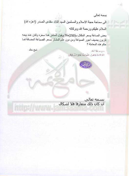 اضافة اجور الصياغة بدون علم المشتري ( استفتاء للسيد القائد مقتدى الصدر اعزه الله بتاريخ 20-9-2011)