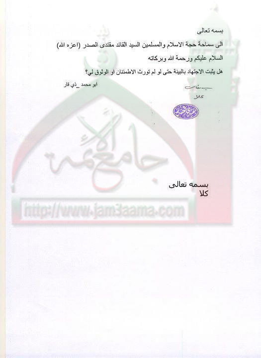 لا يثبت الاجتهاد بالبينة حتى لو لم تورث الاطمئنان او الوثوق ( استفتاء للسيد القائد مقتدى الصدر اعزه الله بتاريخ 20-9-2011)