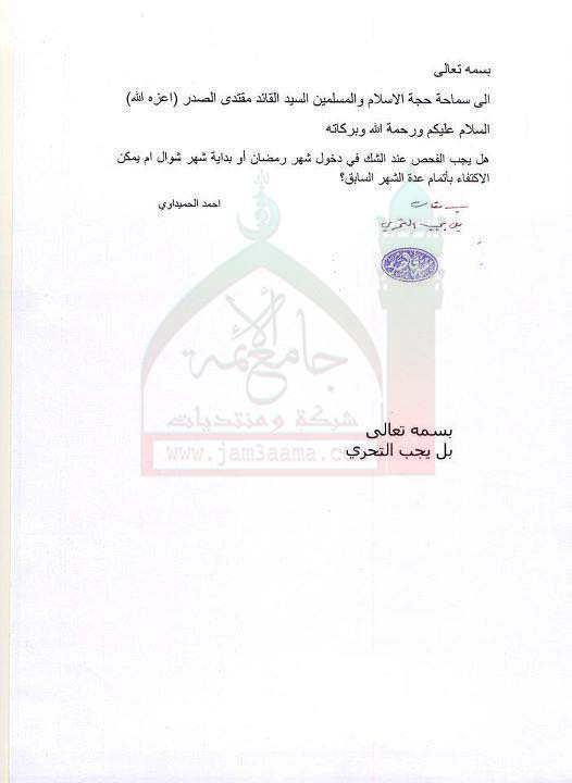 يجب التحري عند الشك في دخول شهر رمضان او بداية شهر شوال ( استفتاء للسيد القائد مقتدى الصدر اعزه الله بتاريخ 20-9-2011)