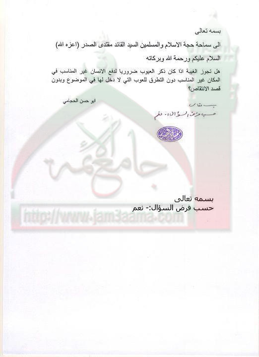 مورد لجواز الغيبة ( استفتاء للسيد القائد مقتدى الصدر اعزه الله بتاريخ 20-9-2011)