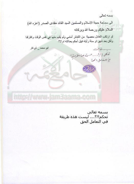 انت تحكم بالعدالة!!؟...ليست هذه الطريقة في التعامل الحق ( استفتاء للسيد القائد مقتدى الصدر اعزه الله بتاريخ 20-9-2011)