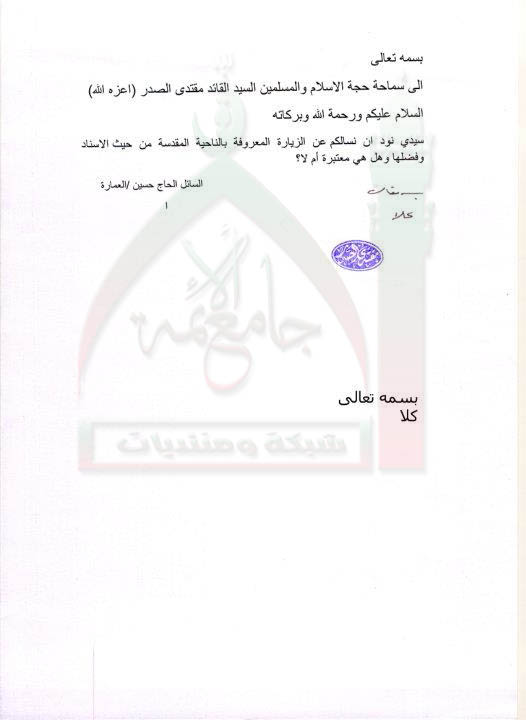 زيارة الناحية المقدسة غير معتبرة ( استفتاء للسيد القائد مقتدى الصدر اعزه الله بتاريخ 20 - 9 - 2011 )