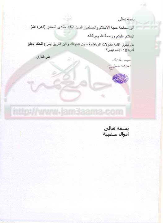 اقامة البطولات الرياضية بدون دفع اشتراك ( استفتاء للسيد القائد مقتدى الصدر اعزه الله بتاريخ 20-9-2011)