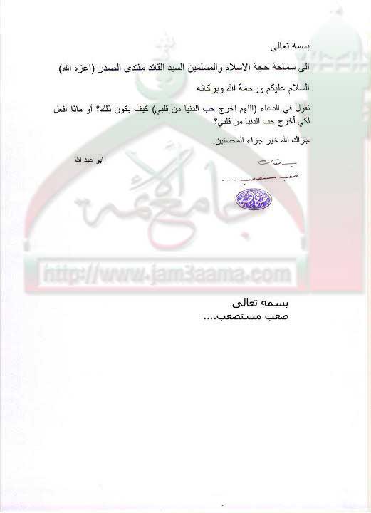 اخراج حب الدنيا من القلب ... صعب مستصعب ( استفتاء للسيد القائد مقتدى الصدر اعزه الله بتاريخ 22-9-2011)