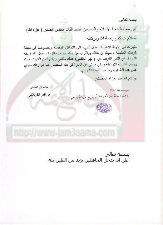 مقاهي لشرب الناركيلة للنساء قرب مقام صاحب الزمان في كربلاء...اظن ان تدّخل الجاهلين يزيد من الطين بلة ( استفتاء للسيد القائد مقتدى الصدر اعزه الله بتاريخ 22-9-2011)