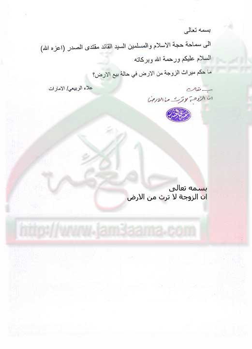 الزوجة لا ترث من الارض ( استفتاء للسيد القائد مقتدى الصدر اعزه الله بتاريخ 24-9-2011 )