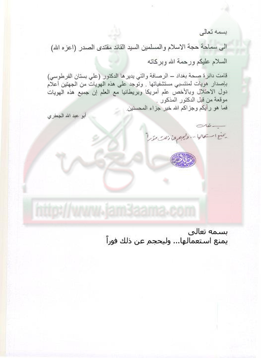 دائرة "صحة بغداد-الرصافة" واصدارها هويات لمنتسبيها عليها اعلام الاحتلال (استفتاء للسيد القائد مقتدى الصدر اعزه الله بتاريخ 26-9-2011)