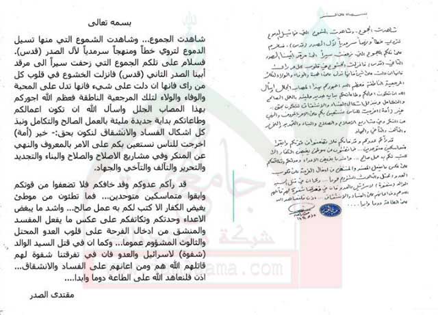 بيان السيد القائد مقتدى الصدر اعزه الله للاخوة السائرين الى قبر الشهيد الصدر قدس سره الشريف 4 - 10 - 2011