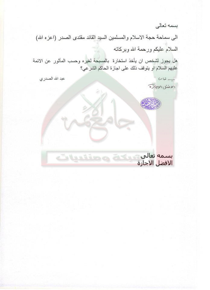 الافضل اجازة الحاكم الشرعي لمن ياخذ الاستخارة بالمسبحة للغير استفتاء للسيد القائد مقتدى الصدر اعزه الله 18-10-2011