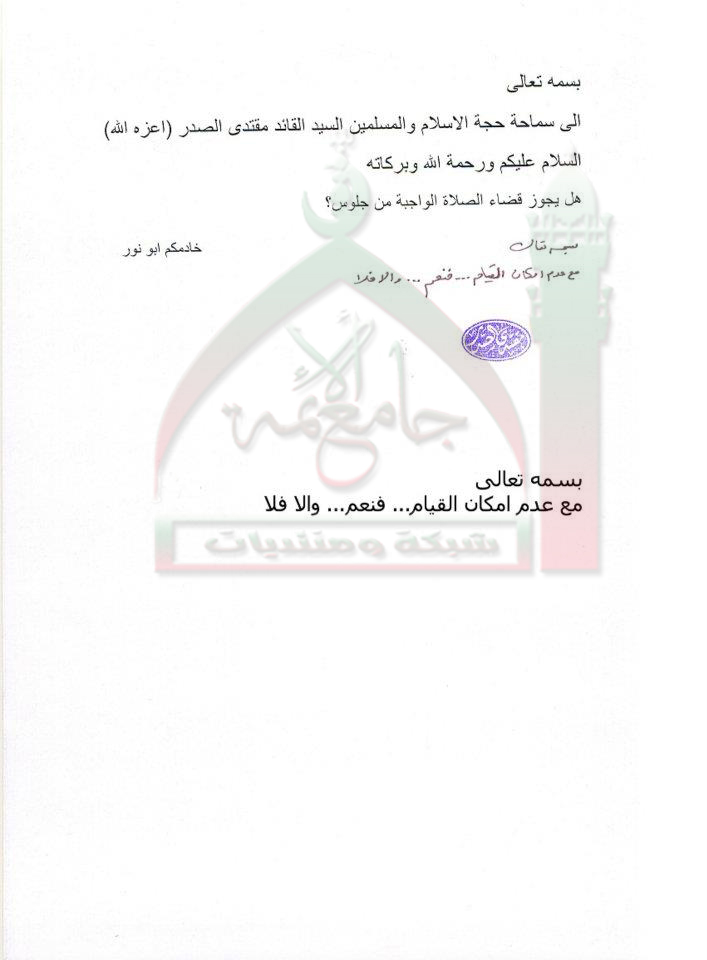قضاء الصلاة الواجبة من جلوس استفتاء للسيد القائد مقتدى الصدر اعزه الله 18-10-2011