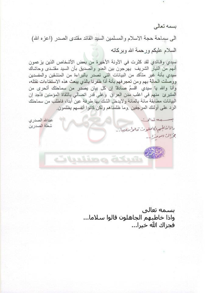 ما يصدر من بيانات بحق المنشقين والمفسدين استفتاء للسيد القائد مقتدى الصدر اعزه الله 18-10-2011