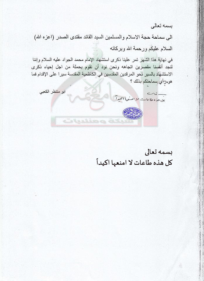 المسير الى مرقد الامامين الكاظميين "ع"في ذكرى استشهاد الامام الجواد "ع"نهاية هذا الشهر استفتاء للسيد القائد مقتدى الصدر اعزه الله 19-10-2011