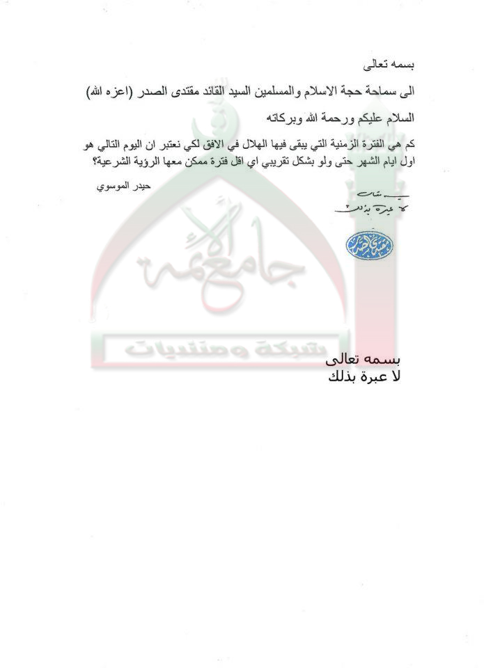 الفترة الزمنية لبقاء الهلال في الافق استفتاء للسيد القائد مقتدى الصدر اعزه الله 20-10-2011