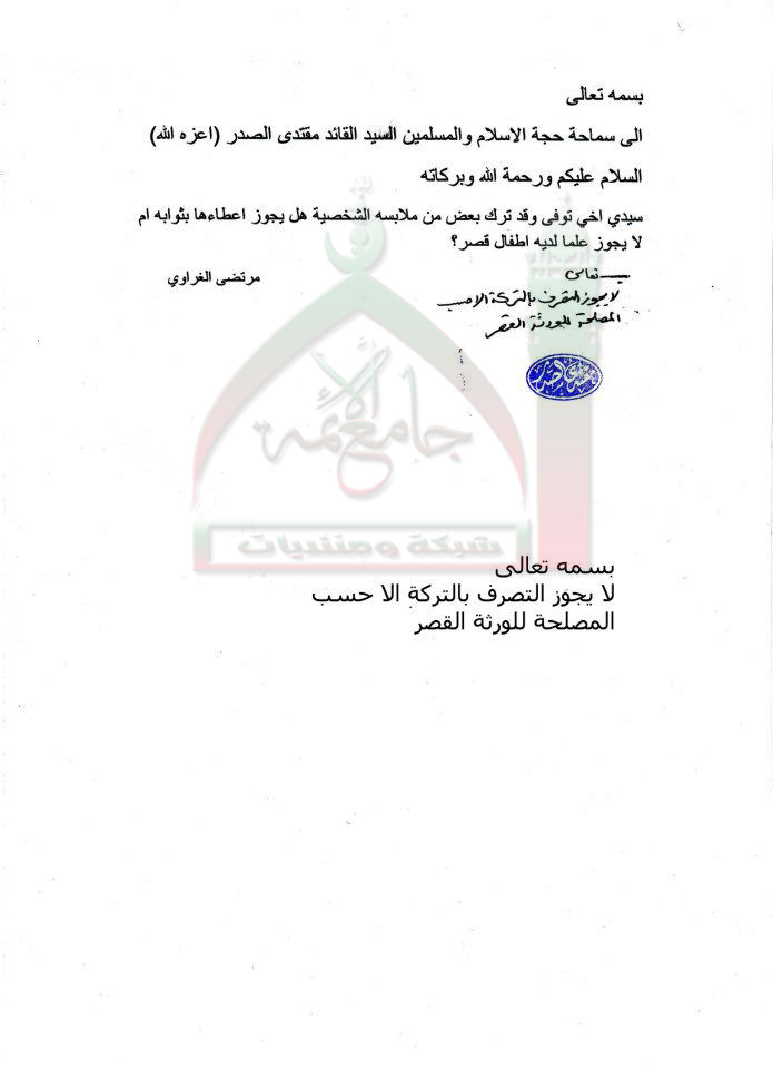 لا يجوز التصرف بتركة المتوفى الا حسب المصلحة للورثة القصر استفتاء للسيد القائد مقتدى الصدر اعزه الله 21-10-2011