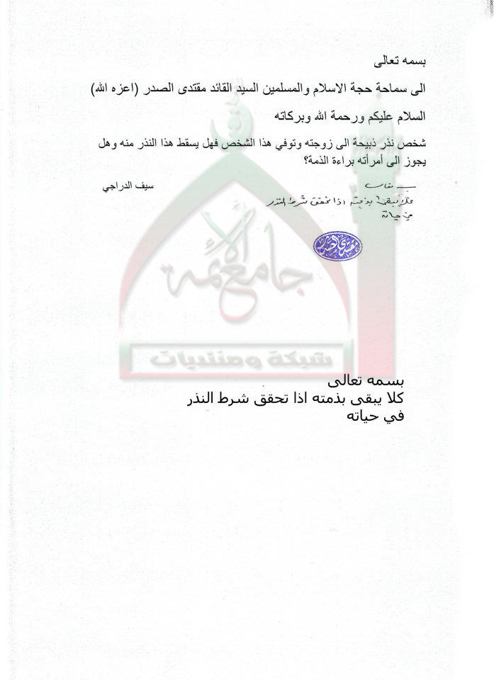 لا يسقط النذر بوفاة صاحبه اذا تحقق شرط النذر في حياته استفتاء للسيد القائد مقتدى الصدر اعزه الله 21-10-2011