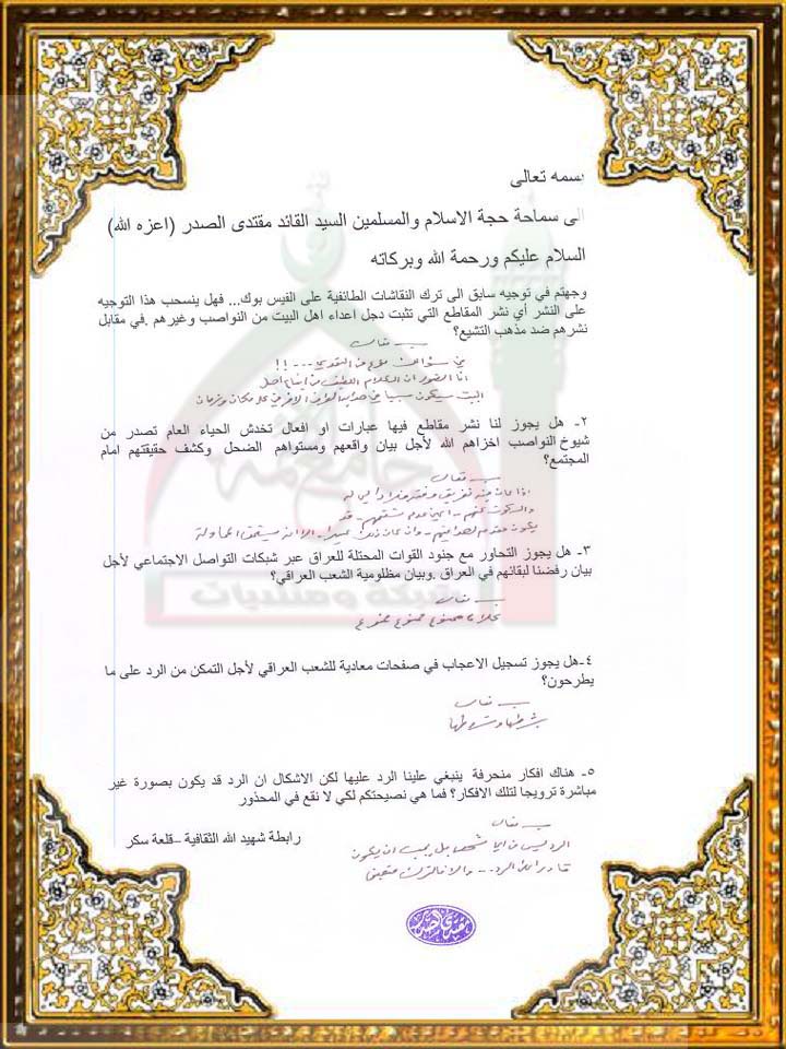 مخالطة الاعداء في الانترنت استفتاء للسيد القائد مقتدى الصدر اعزه الله 21-10-2011
