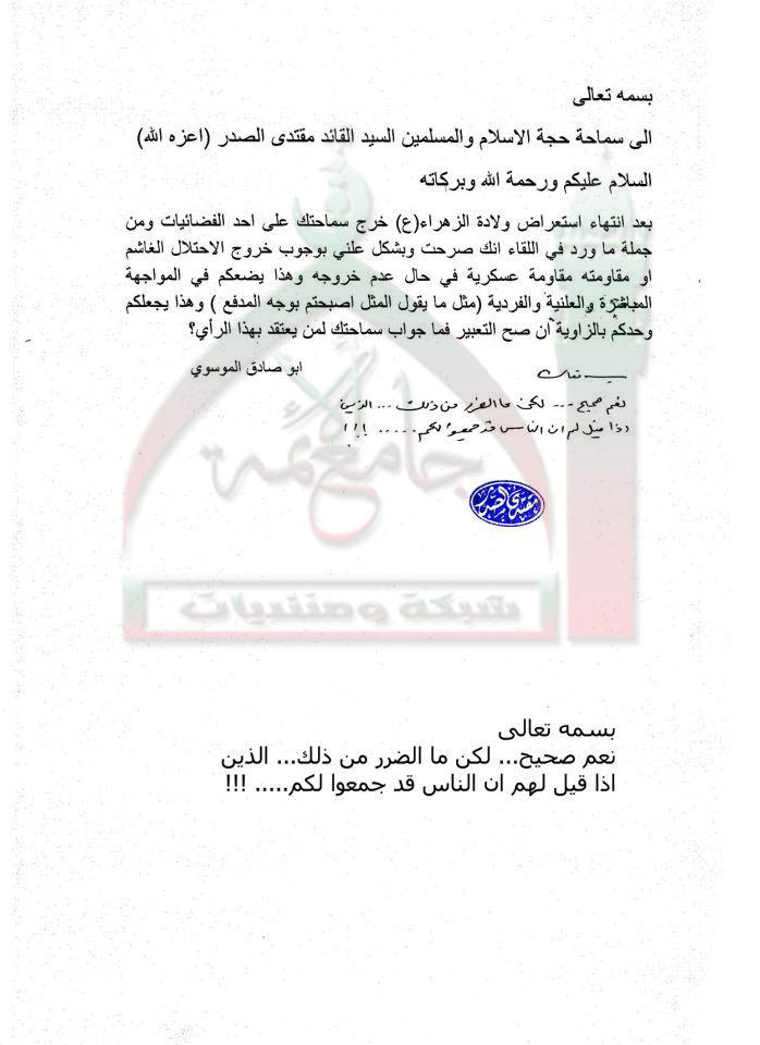 تلويح سماحته بعد استعراض"ولادة الزهراء ع"بالمقاومة العسكرية ان لم يخرج الاحتلال في موعده المقرر استفتاء للسيد القائد مقتدى الصدر اعزه الله 21-10-2011