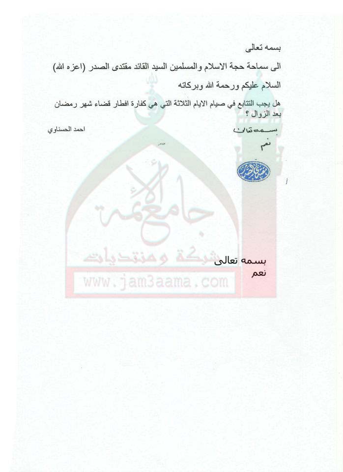 يجب التتابع في صوم الايام الثلاثة "كفارة افطار قضاء شهر رمضان بعد الزوال استفتاء للسيد القائد مقتدى الصدر اعزه الله 23-10-2011