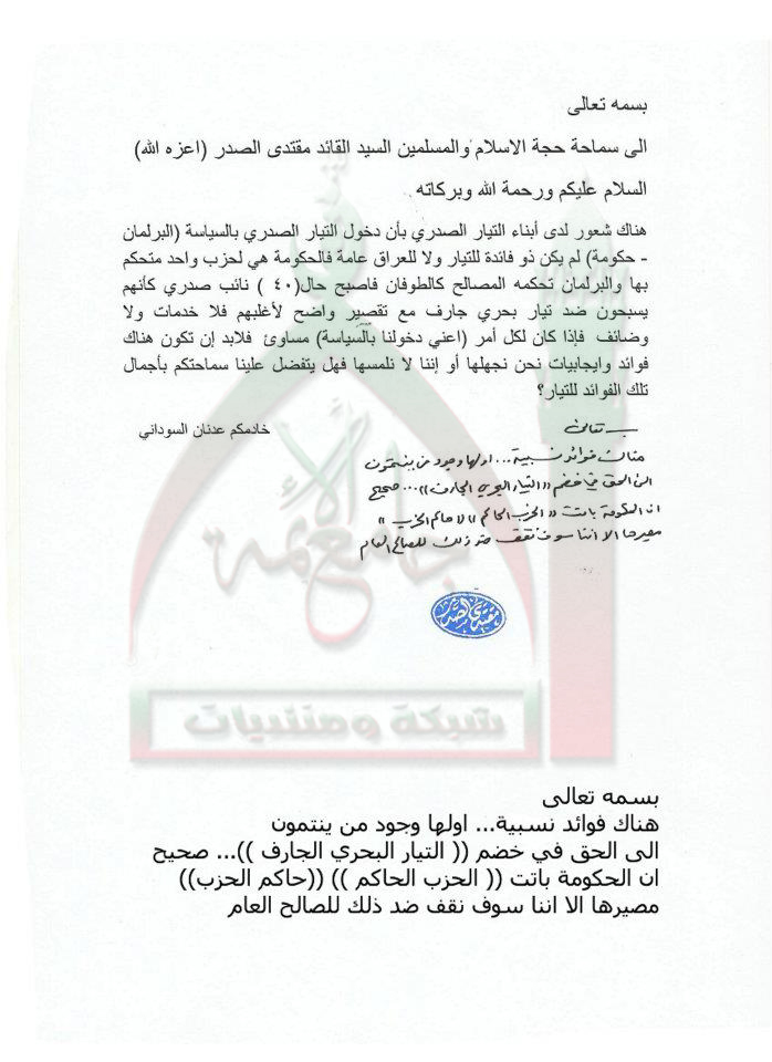 دخول "التيار الصدري"في العملية السياسية -الفوائد والمساؤى استفتاء للسيد القائد مقتدى الصدر اعزه الله 23-10-2011