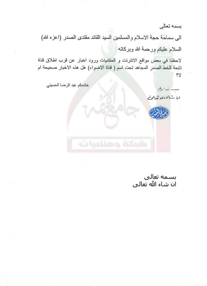 قرب اطلاق قناة فضائية تابعة للتيار الصدري تحت اسم"قناة الاضواء" استفتاء للسيد القائد مقتدى الصدر اعزه الله 23-10-2011