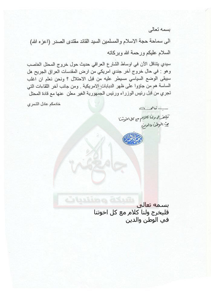 استقرار الوضع السياسي بعد خروج قوات الاحتلال استفتاء للسيد القائد مقتدى الصدر اعزه الله 24-10-2011