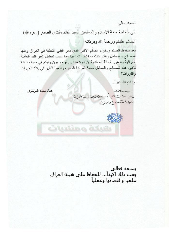 تاهيل المصانع والمعامل العراقية التي دمرت بعد دخول قوات الاحتلال الامريكي لارض المقدسات استفتاء للسيد القائد مقتدى الصدر اعزه الله 24-10-2011