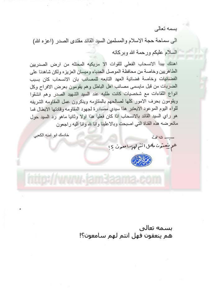 قناة العهد "العصائبية"وحملاتها التضليلية في صرف الانظار عن دور مقاومة الخط الصدري الشريف في اخراج الاحتلال استفتاء للسيد القائد مقتدى الصدر اعزه الله 26 - 10 - 2011