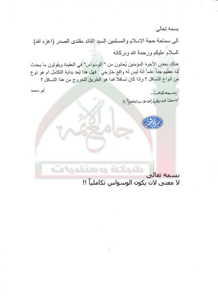 الوسواس في العقيدة استفتاء للسيد القائد مقتدى الصدر اعزه الله 26 - 10 - 2011