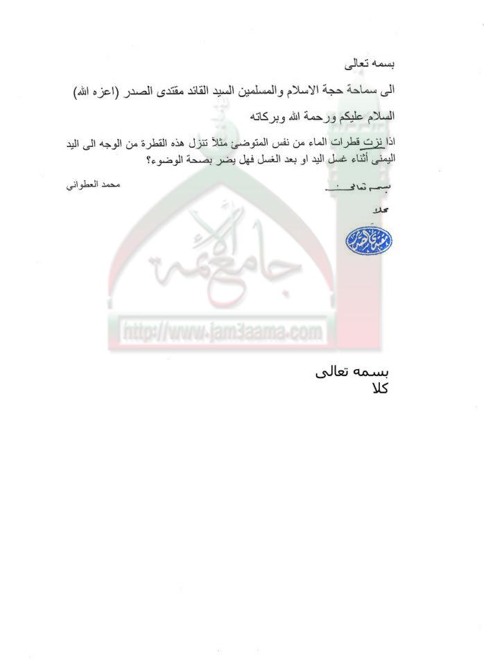 حكم نزو قطرات ماء الوضوء من نفس المتوضىء الى باقي اعضاء وضوئه الاخرى استفتاء للسيد القائد مقتدى الصدر اعزه الله 26 - 10 - 2011
