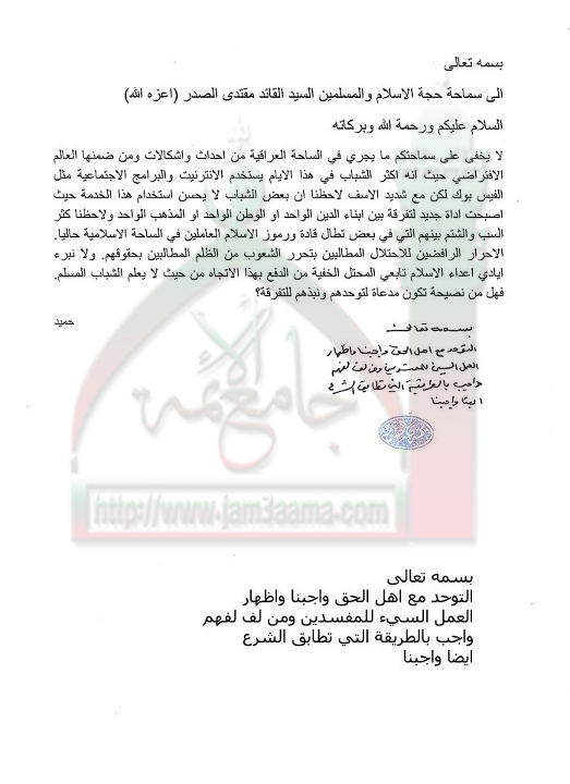 طلب نصيحة للتوحد في الفيس بوك استفتاء للسيد القائد مقتدى الصدر اعزه الله 28 - 10 - 2011