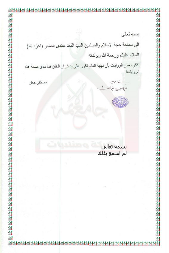 مدى صحة الروايات : نهاية العالم على يد شرار الخلق استفتاء للسيد القائد مقتدى الصدر اعزه الله 28 - 10 - 2011