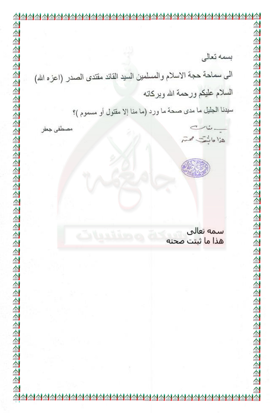 مدى صحة الرواية : ما منا الا مقتول او مسموم استفتاء للسيد القائد مقتدى الصدر اعزه الله 28 - 10 - 2011