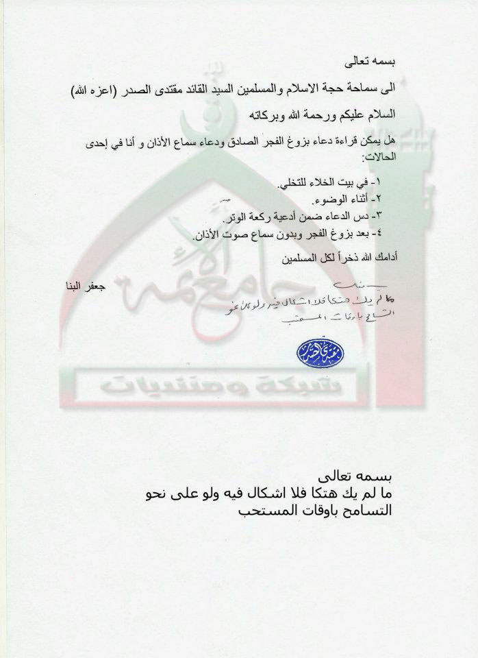 قراءة ادعية بزوغ الفجر الصادق وسماع الاذان استفتاء للسيد القائد مقتدى الصدر اعزه الله 30 - 10 - 2011